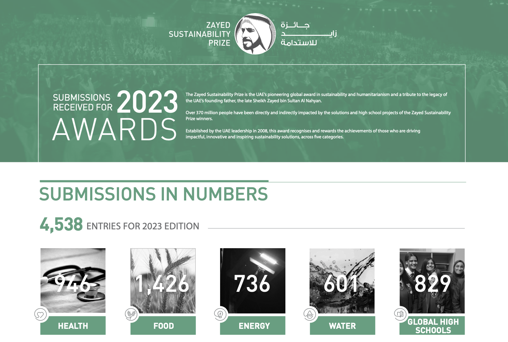 2008年にUAEの指導者によって設立された同賞は、5つの部門において、インパクトのある革新的で刺激的なサステナビリティ・ソリューションを推進している人々の功績を称え、その功績を称えるためのものです。