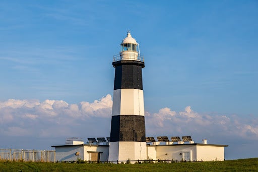 オホーツク海に突き出た能取岬に立つ灯台。白黒の帯をまとう八角形の形は、江戸末期に来日したフランス人技師の影響を受けています。岬一帯はひらけた牧草地で、夏には北海道らしいのどかな風景が見られる一方、冬は流氷の名所としても知られています。