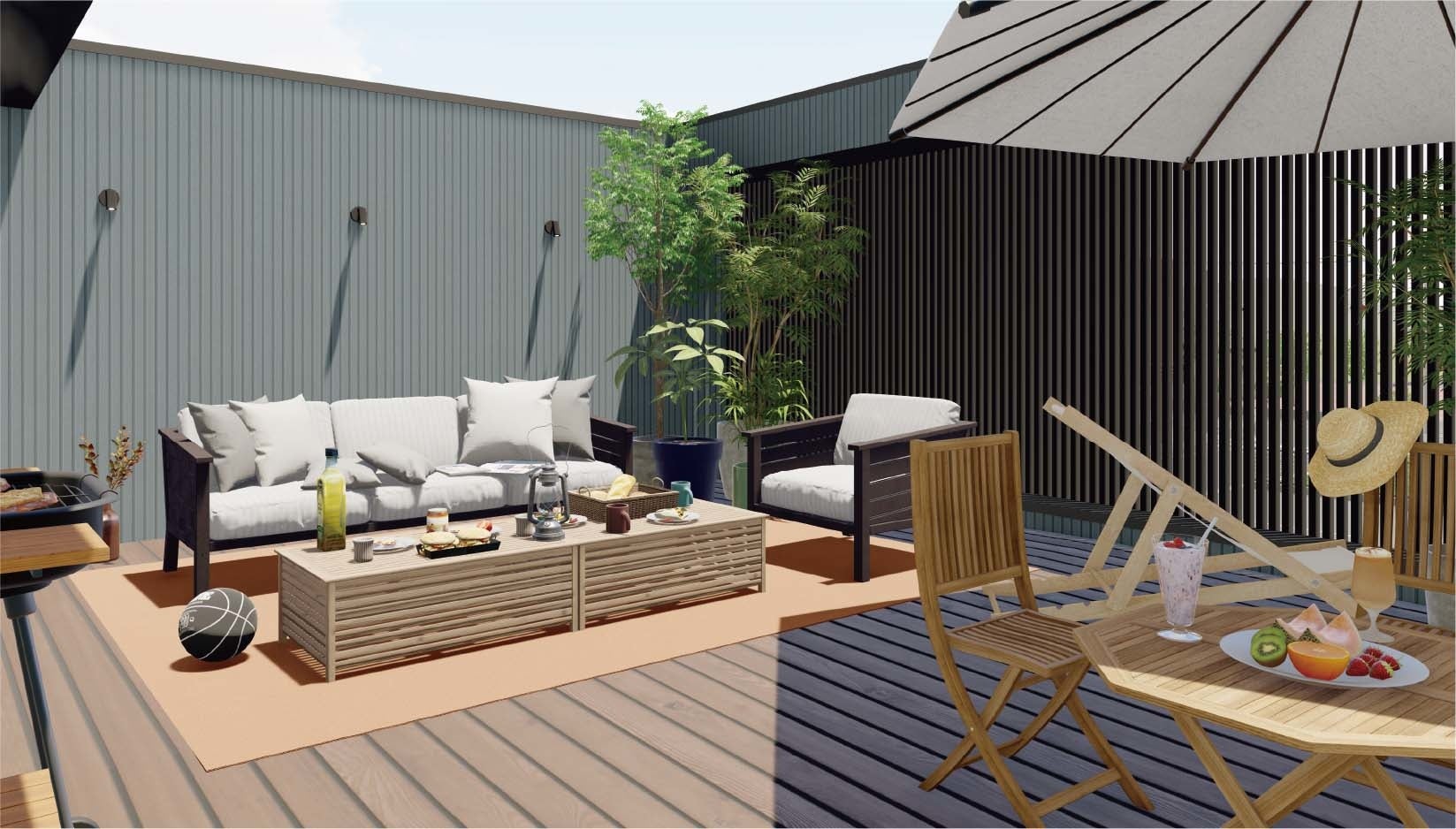 2階リビングの横には友人家族とも団欒が楽しめる、広々ルーフバルコニー。出かけたくないけど、開放的な気分になりたいときは気軽に楽しめるスペース