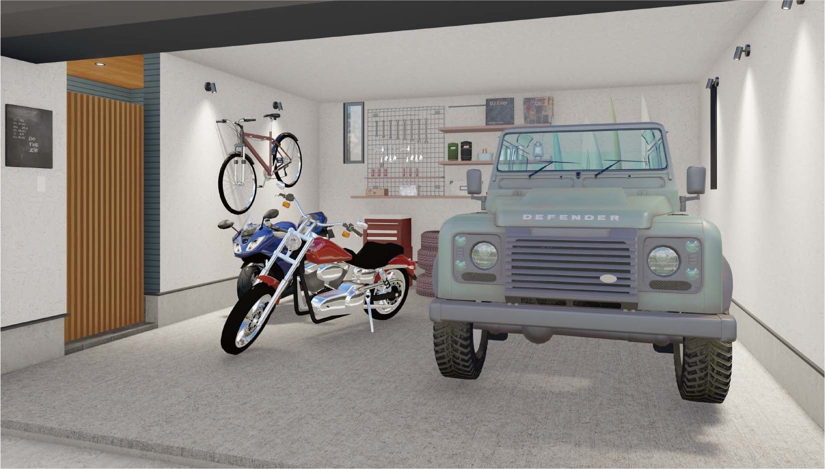 一階玄関横には、大きなビルトインガレージ、車はもちろん、アウトドアギア、サーフボードや釣り道具までなんでも好きなものしまえる楽しいスペース