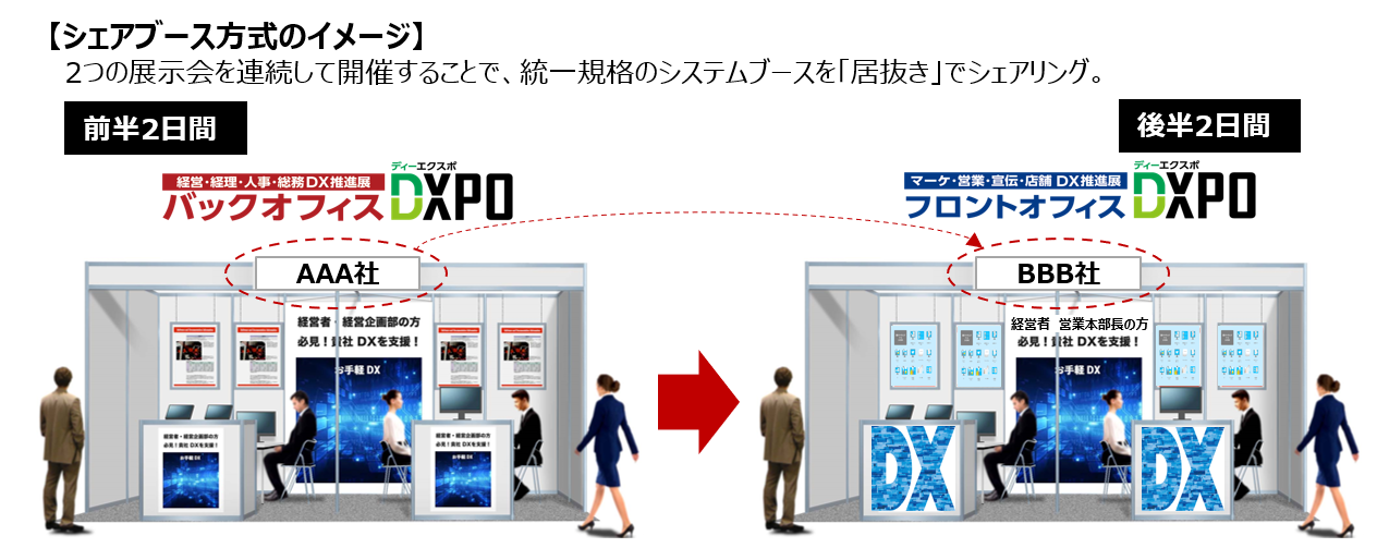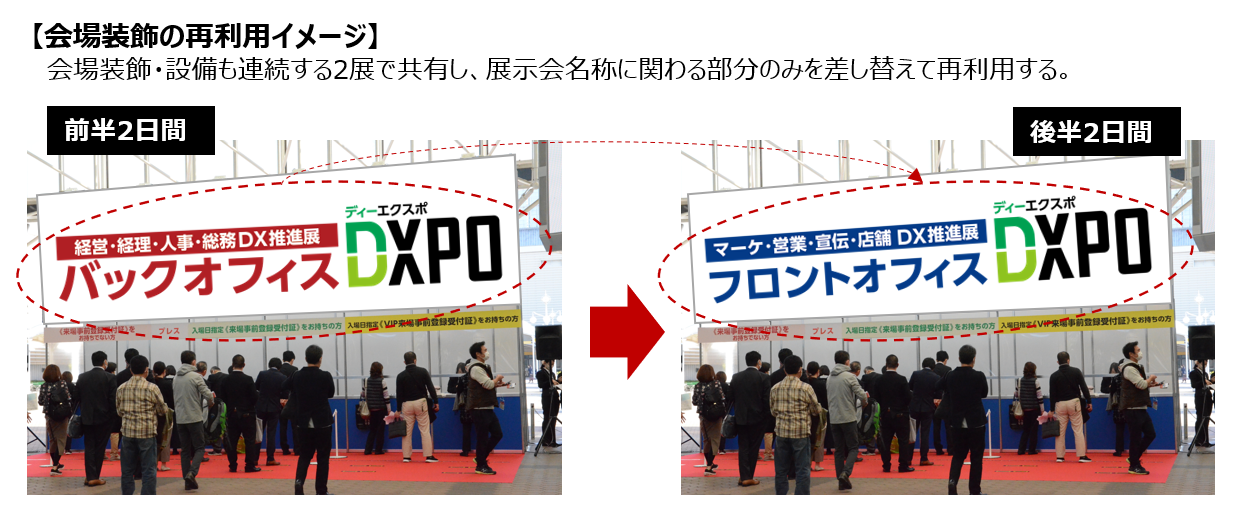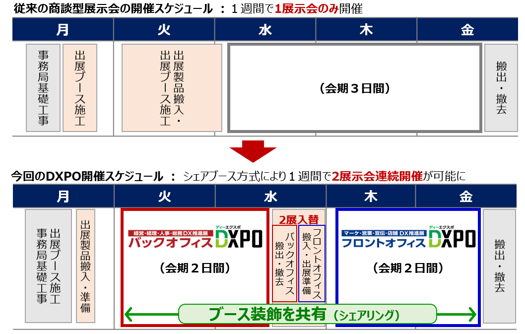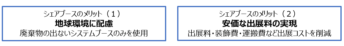 “シェアブース”方式とは「地球環境への配慮と経済性の観点から、出展ブースを複数社でシェアする」という新発想のもと、当社が考案・命名した展示会運営の新方式だ。2つの展示会を連続して開催することで、ブース装飾はもとより、使用した会場受付、看板、その他の装飾物・備品等を居抜きの形で再利用。残材・廃棄物の発生を最小限に抑えるとともに、施工・運営にかかるコストを大幅に削減する。