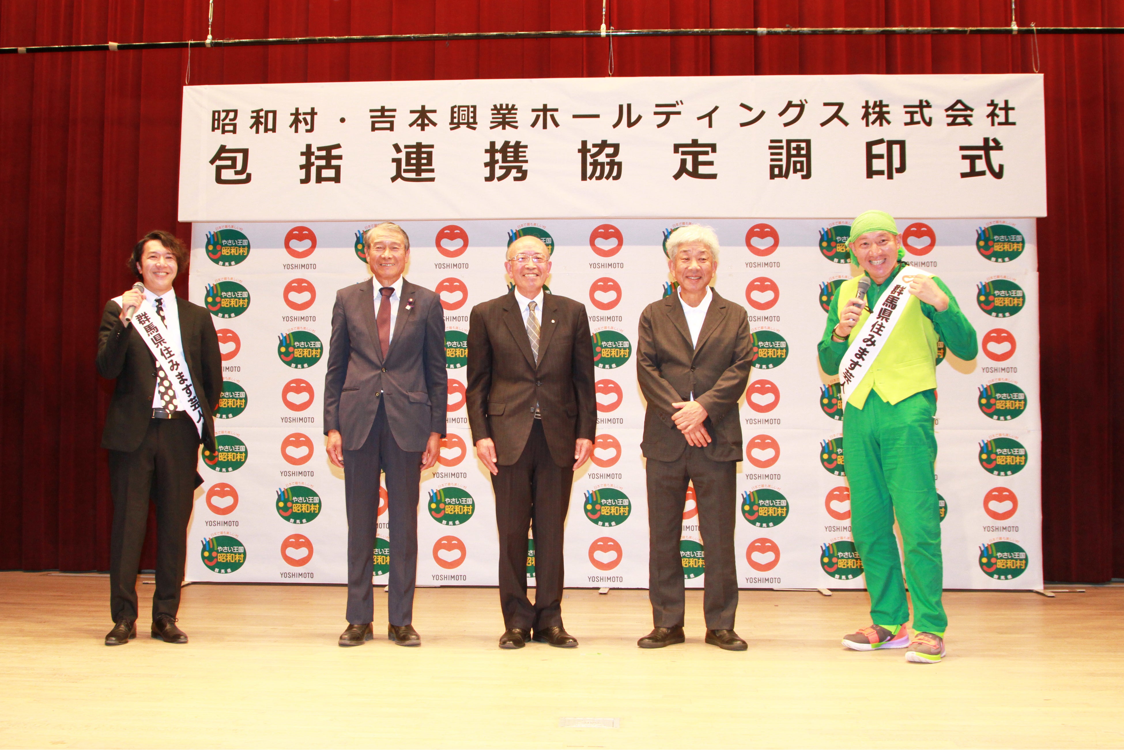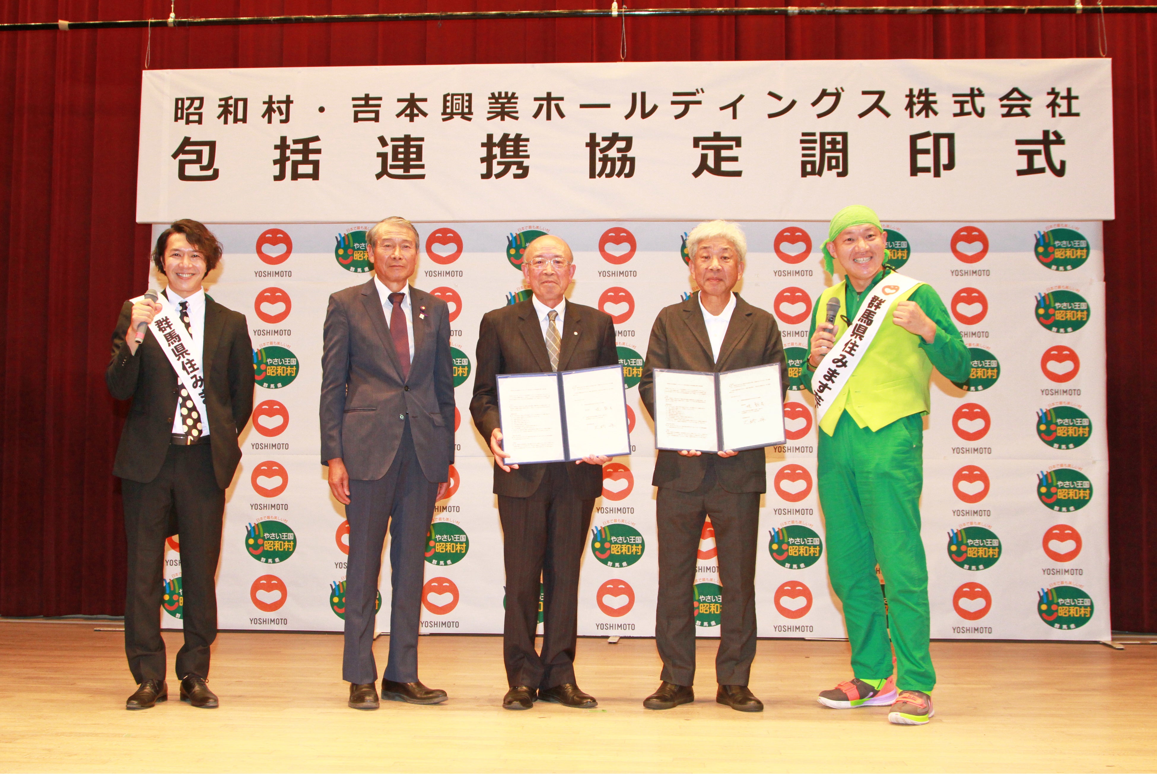 弊社のタレント、社員が東京や大阪などで、日々、視聴率が勝った、負けたという仕事に追われる日々だけを送るのではなく、昭和村に通い、村民の皆さんとご一緒することで、明るく分かち合える幸せや農業の収穫の喜びなどを教えていただきたいと考えております。昭和村が誇る農作物をより広く、日本中、アジア各国に知っていただくために、笑いの力も少しはお役に立てられればと思っております。
