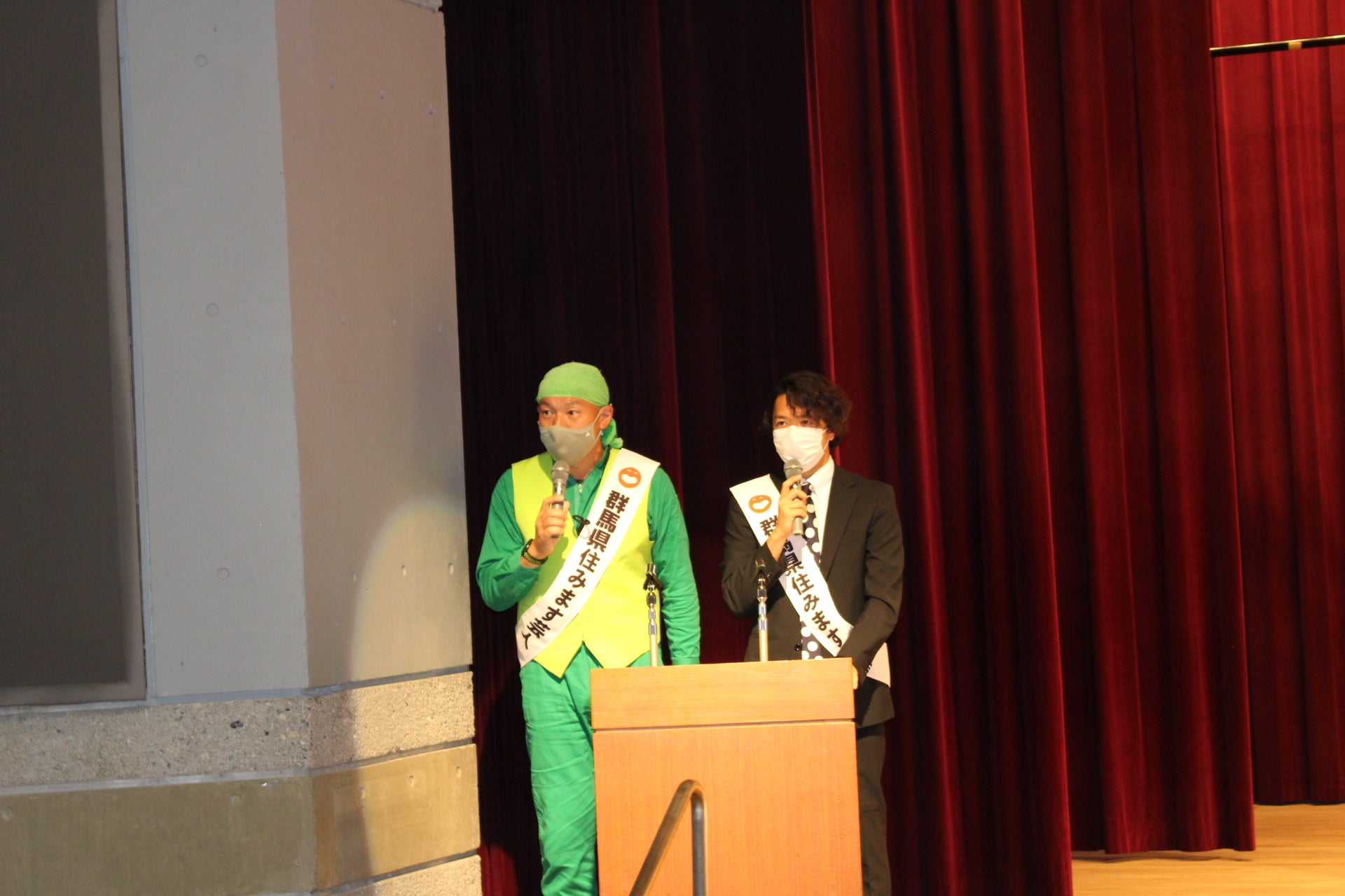 司会を務めたのは、群馬県住みます芸人のガッツいわせと、チョッキGT5000。登壇者のご紹介に続き、今回の包括連携協定に至った経緯と協定の内容についてご説明させていただきました。