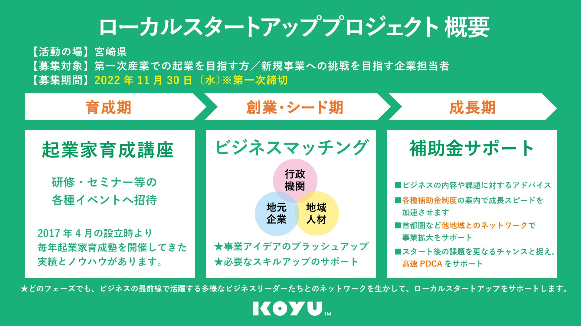研修やセミナーを通じて育成し、こゆ財団の持つノウハウや多様なネットワークを生かし、0から1の事業立ち上げからグロースまでを支援し、社会への価値提供と地域の活性化、雇用創出を目指すプロジェクトです。