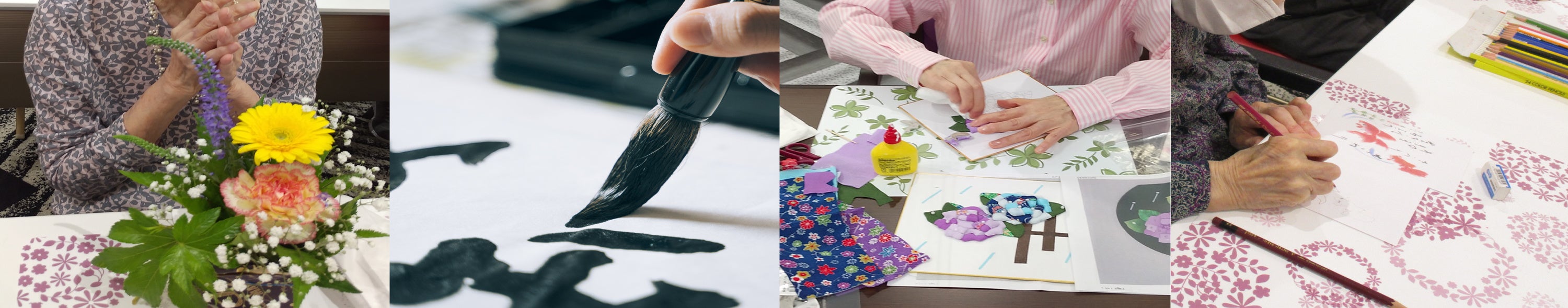 人気のフラワーアレンジメントや書道、手芸、絵手紙、クイズ形式の楽しみながらできる脳活、心なごむ音楽鑑賞、映画鑑賞など、非常に多くのアクティビティを実施しています。