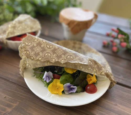 天然素材から作られたミツロウラップなので、程よい通気性、保湿性、そして抗菌性により、包んだ食品の栄養素と鮮度の持ちを良くしてくれます。繰り返し使え使用後は土に還って堆肥になり、プラゴミが出ない環境や健康に優しいエコなラップです。野菜や果物を包んでの保存や、お皿やコップの蓋、常温おにぎり・パン・おやつなど、様々な型のものを直接包めます。