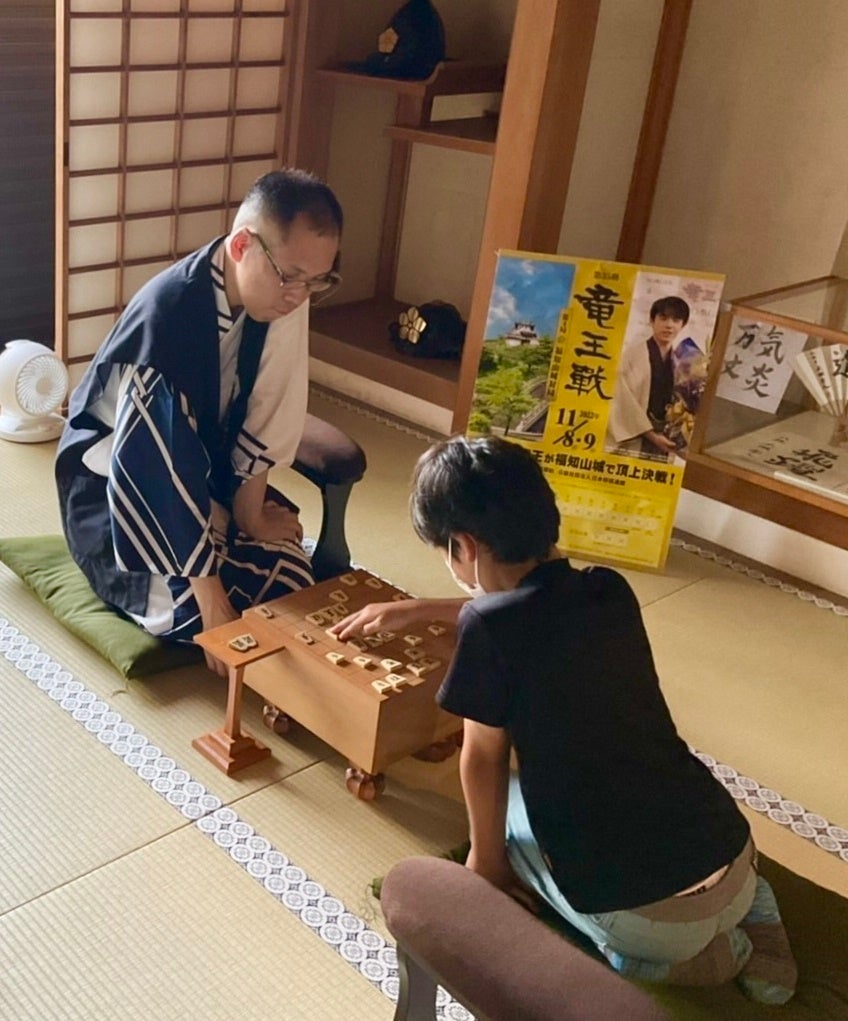 7月17日、プロ棋士の島本亮五段が福知山城の将棋フォトスポットにサプライズ訪問! 来城者との対局を楽しみました。