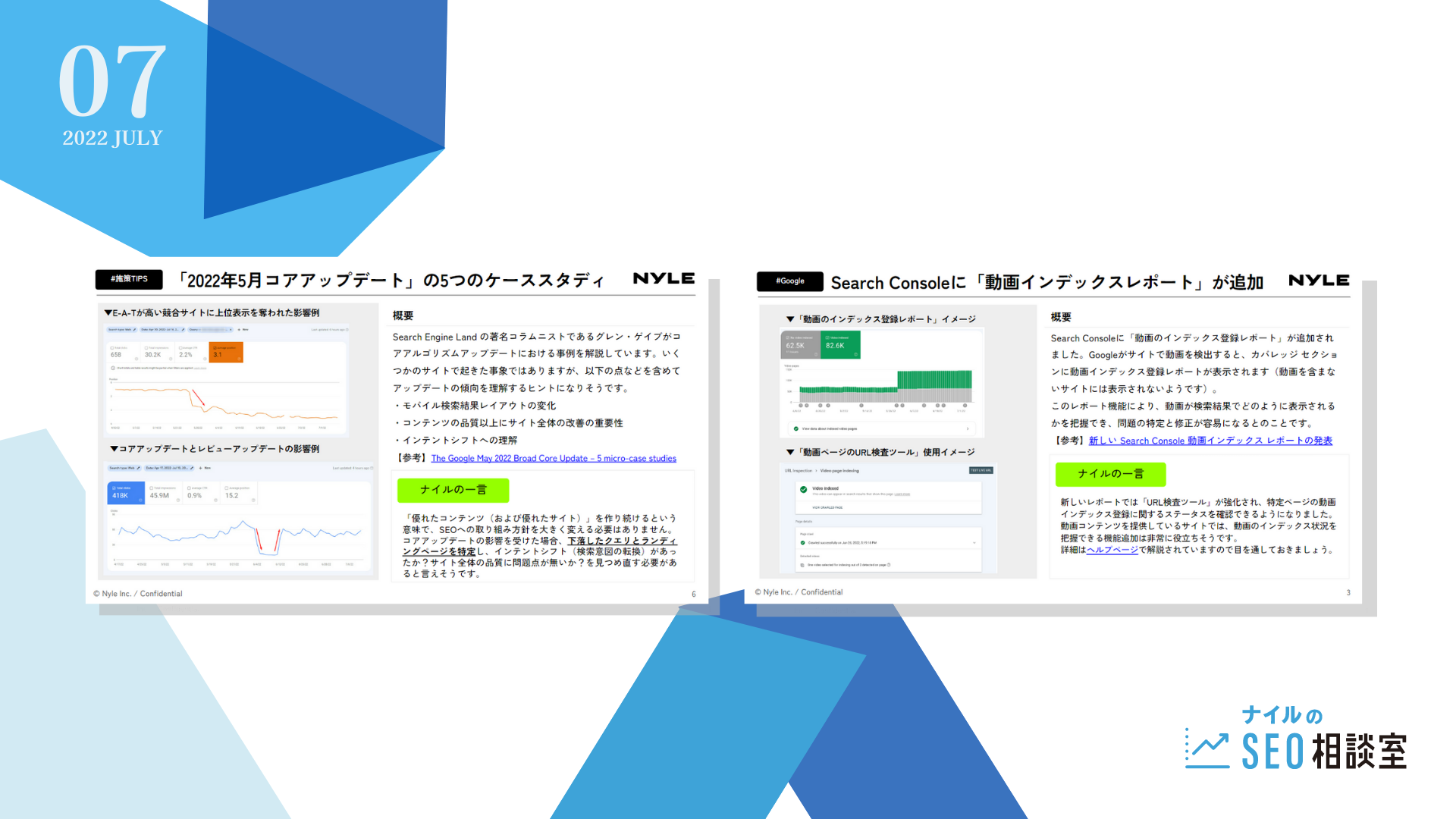 ナイルでは、日々Googleの最新動向や、成果の出るSEO施策を提案するための情報を、国内外から収集し分析しています。「ナイルのSEO相談室」では、SEOニュースとしてサイト運営に役立つ最新情報をまとめ、毎月無料で公開しています。さらに、2,000社以上のコンサルティング実績をもつナイルの視点として、注目ポイントを端的に解説。日々時間に追われるサイト運営者様でも、短時間でSEOのトレンドを理解できるレポートです。