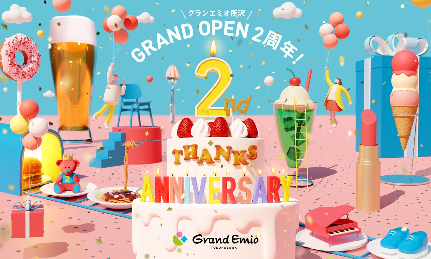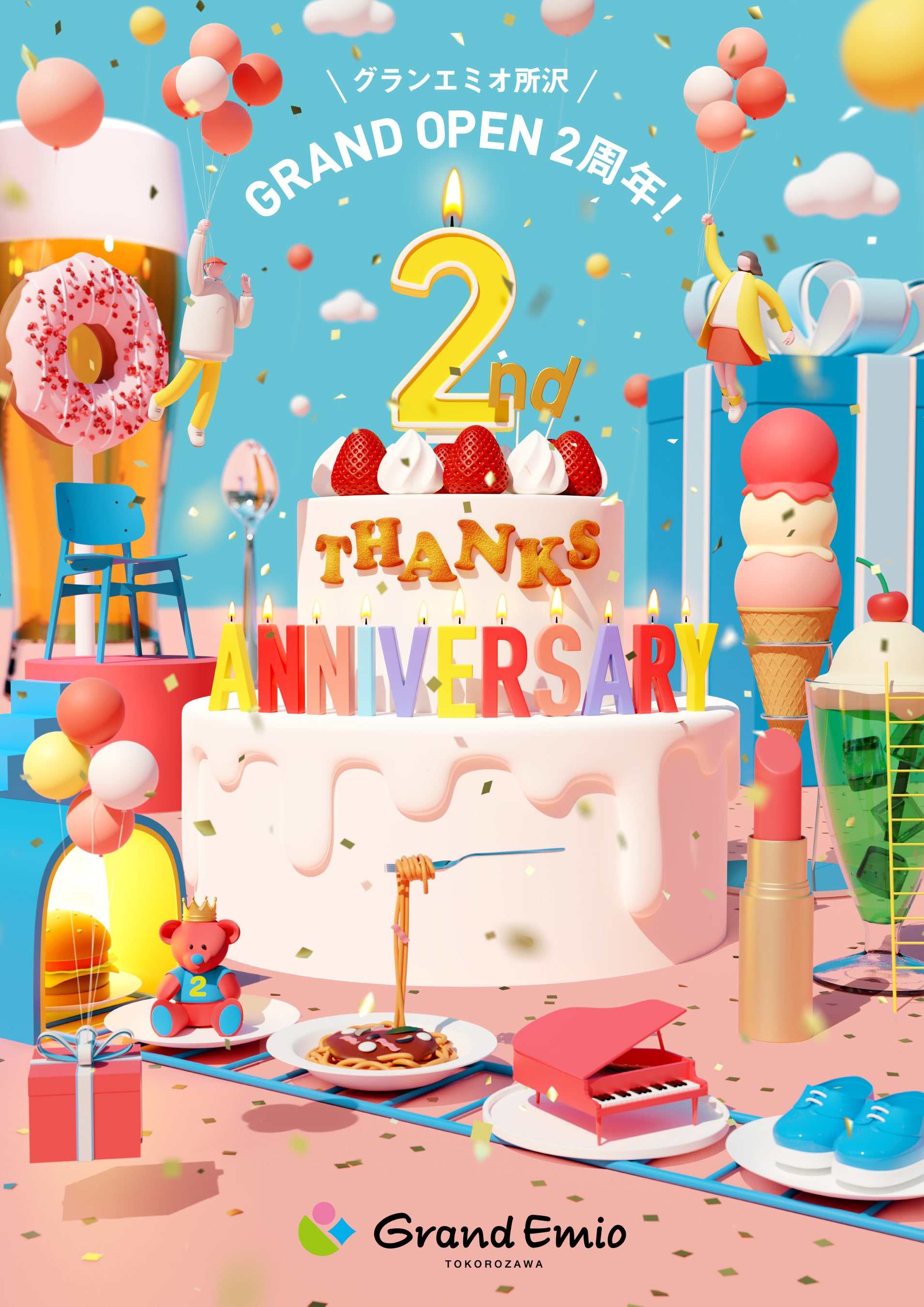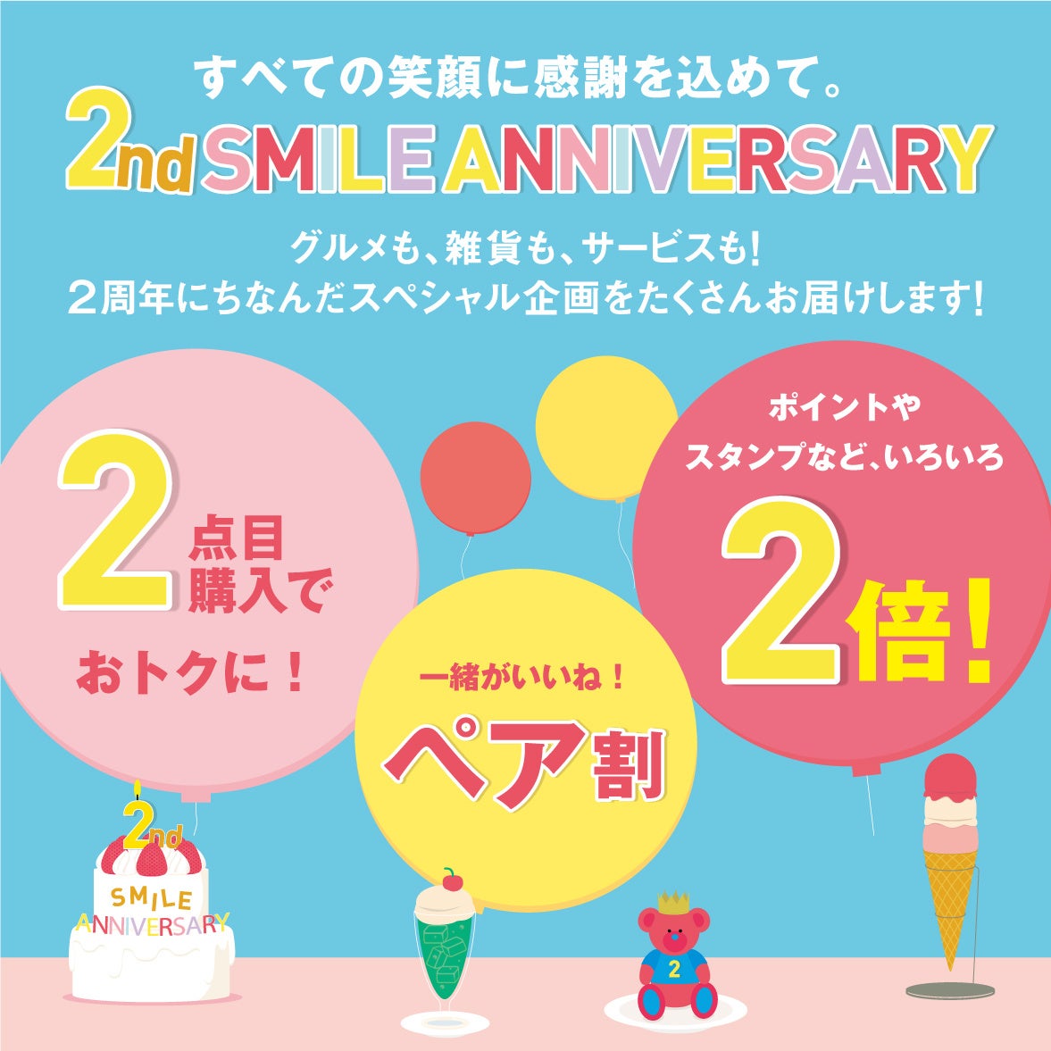 2周年を記念して、各店舗より「2」にちなんだサービスを展開。レストランメニュー2倍盛りや2点以上のお買い上げでお得なサービスがうけられるW割、2周年記念セットの販売など、お得な特典が満載です。