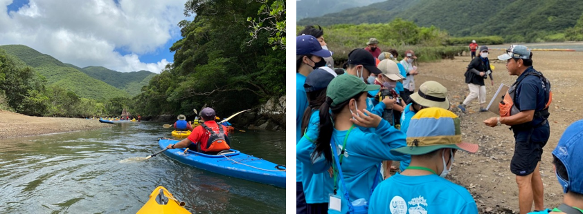 カヌー発着所に移動し、カヌーに乗船。100万年以上もの期間独自の進化をたどった「リュウキュウアユ」の生息地である、マングローブ原生林をカヌーで探索しました。マングローブのトンネルの中を抜け、マングローブ干潟に到着。干潟を歩きながら、黒潮の森マングローブパーク統括の中岡さんに「マングローブ林の役割」についてのお話を聞きました。マングローブ干潟を散歩していると、様々な生き物に出会い、海の魚たちに豊富なエサや幼魚の生育環境を与えていることや、周辺地域の生態系に深くかかわり、様々な動物たちの命を育んでいることを実際に見て、聞いて、触れあい、肌で体感し、子供たちは、豊かな生態系を守る事が地球環境にとって重要な役割だということに気付きました。