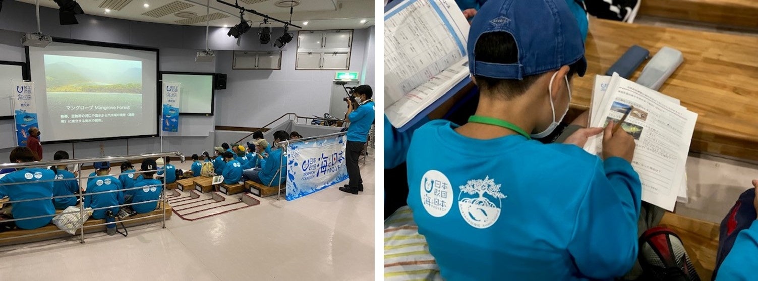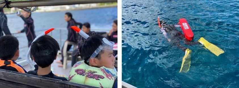 2日目は、ボートで名瀬港を出発し、シュノーケリングエリアへ向かいました。海の中を見てみるとサンゴ礁の周りをたくさんの海の生き物が泳いでおり、子供たちは、マングローブから流れ出る栄養豊かな水で育まれたサンゴ礁が海の生物多様性を守っていることに納得した様子でした。マングローブ、サンゴともに豊かな海の生態系に、重要な役割を果たしており、奄美大島の人たちが大切に守ってきているということに気づき、未来の海を守るために自分たちに何ができるかを探検隊のみんなで考えました。