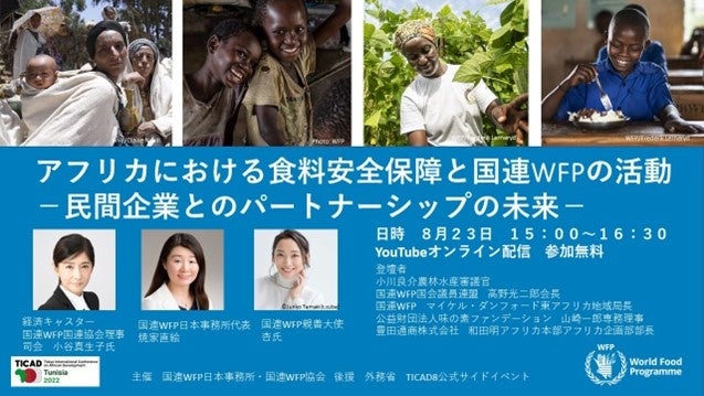 WFP国連世界食糧計画日本事務所と認定NPO法人国連WFP協会は、第8回アフリカ開発会議(TICAD8)に先立ち、8月23日(火)にオンラインでTICAD8の公式サイドイベントを開催します。アフリカにおける食料安全保障の課題や、国連WFPの命を救う緊急の食料支援、コミュニティーの強靭性や自立を高める開発支援の重要性について議論するとともに、民間企業の役割や国連機関との連携について考えます。