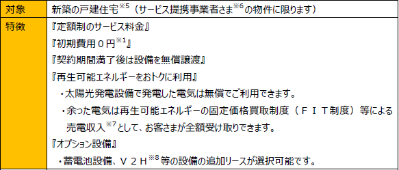 ※1:リース対象設備本体は初期費用0円で導入できますが、設置に関する費用はお客さま負担です。関西電力が提携する住宅建築会社さまにリース対象設備を支給し、設置工事は住宅建築会社さまが行います。
