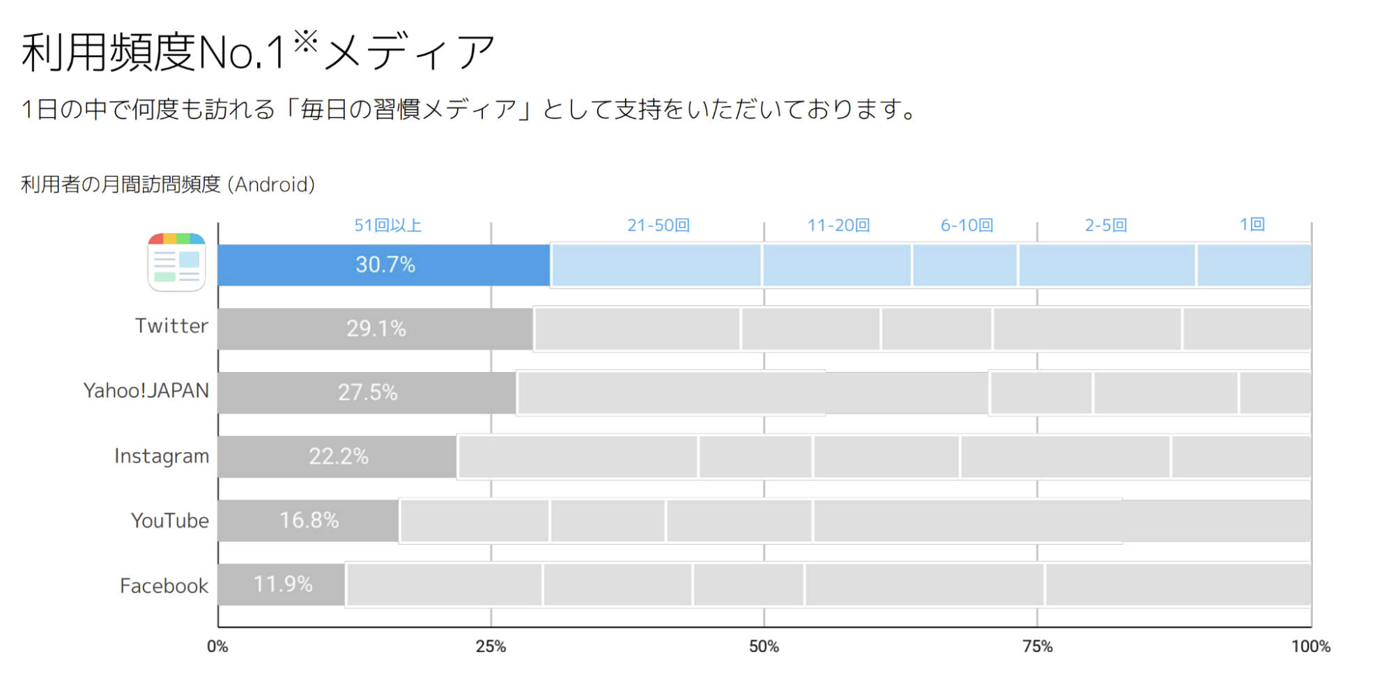 SmartNewsは日本最大級のシェアを誇るニュースアプリで、月間ユニークユーザー数2,000万人を突破しています。また、利用頻度No.1のメディアとして、1日に何度も訪れる「習慣メディア」として支持されています。