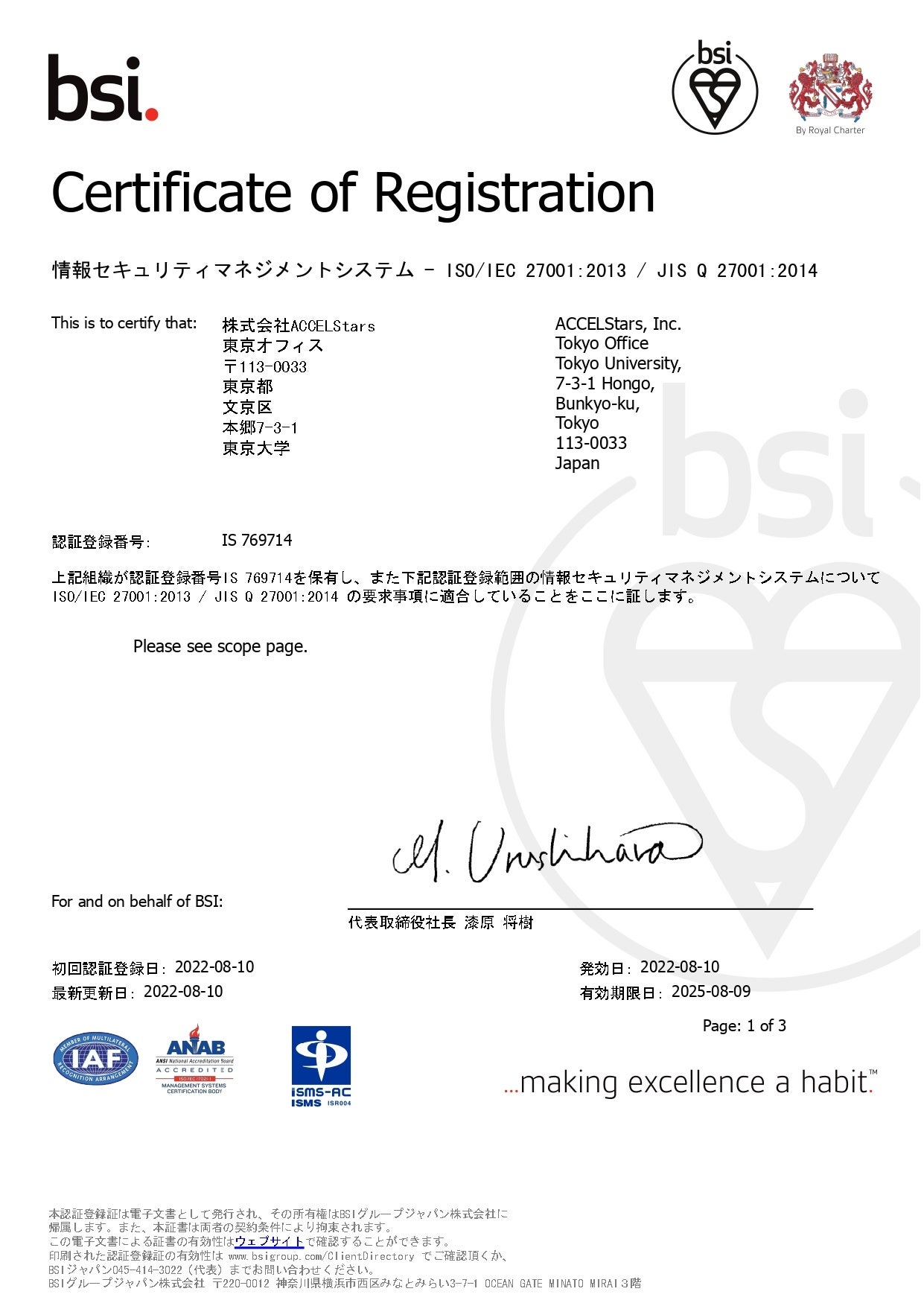 東京大学医学部発のMedical Sleep Techスタートアップである株式会社ACCELStars(アクセルスターズ)(本社:福岡県久留米市、代表取締役社長:宮原禎、以下、「ACCELStars」)は、ISMS(情報セキュリティマネジメントシステム)の第三者認証基準である国際規格「ISO/IEC 27001:2013(JIS Q 27001:2014)」を8月10日に取得しましたのでご報告申し上げます。