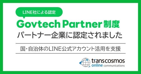 transcosmos online communicationsは、LINEを活用した行政のDXツール「KANAMETO(カナメト)」の開発・提供によって、行政サービスのデジタル化や、住民と行政のコミュニケーションの課題解決を支援してまいりました。これまでに、LINE社が提供する各種法人向けサービスの拡販および機能追加・改善をより積極的に推進することを目的に導入された「LINE Biz Partner Program」の「Technology Partner」において、認定バッジ「Customer Care」及び「Engagement」を取得しております。2022年8月現在、「KANAMETO(カナメト)」は全国で120を超える地方自治体に導入されています。