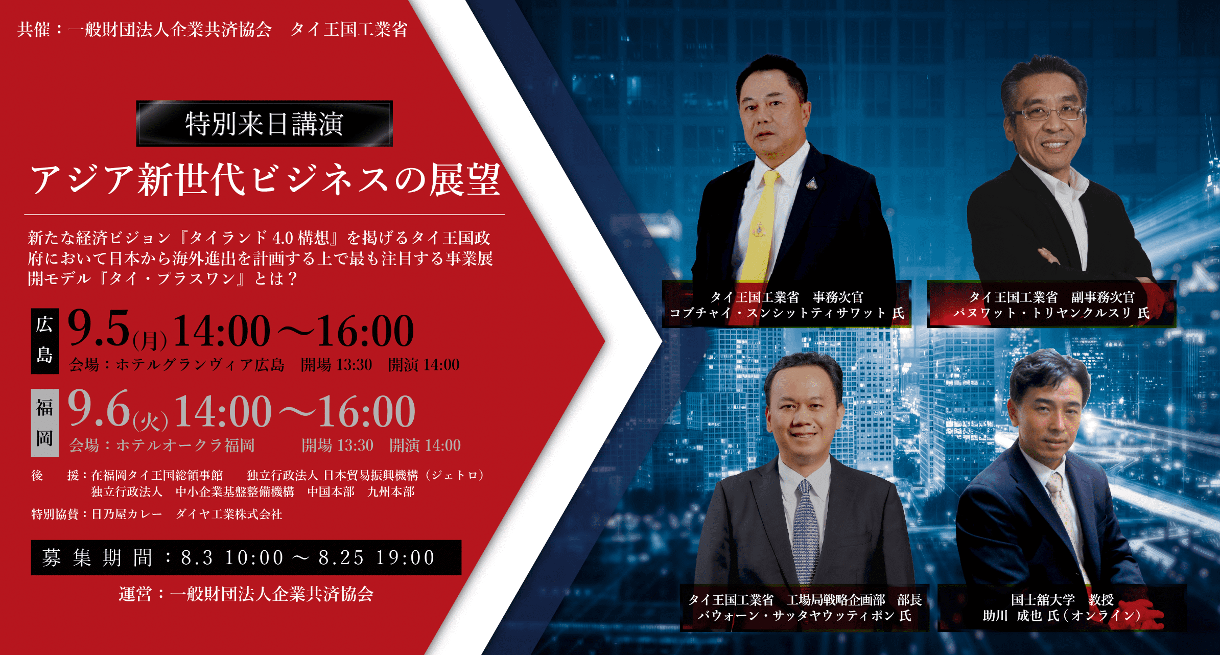 一般財団法人企業共済協会(東京都港区)とタイ王国工業省で共催する特別来日講演『アジア新世代ビジネスの展望』を9月5日広島、6日福岡にて開催します。