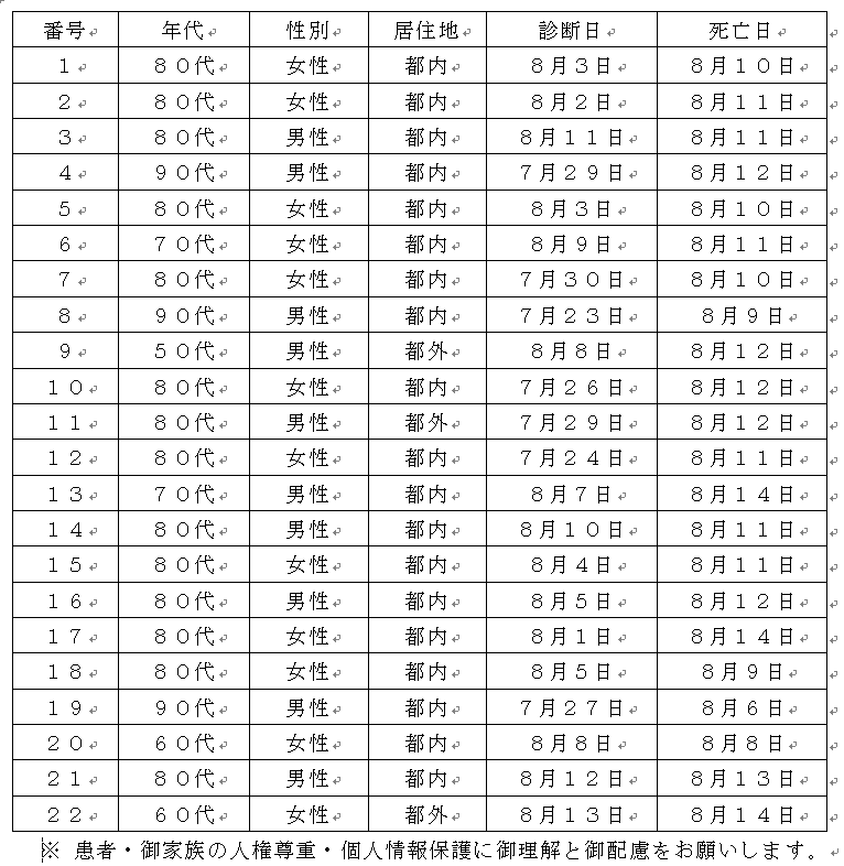 新型コロナウイルスに関連した患者の死亡について business Twitter Facebook はてブ Pocket LINE コピー 2022.08.17 この記事は約1分で読めます。 都内で新型コロナウイルスに感染した方が死亡されましたのでお知らせします。 お亡くなりになった方のご冥福をお祈り申し上げます。