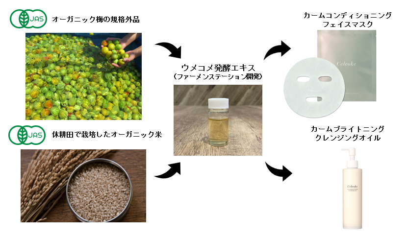今回開発した「ウメコメ発酵エキス((アスペルギルス/サッカロミセス)/(ウメ果実/コメ)発酵粕エキス)」は、岩手県奥州市の休耕田を再生し栽培された有機JAS認証のオーガニック米と、和歌山県の紀州口熊野地域で栽培された有機JAS認証のオーガニック梅の規格外品を原材料とし、それらを発酵し抽出される発酵粕をもとに、植物由来のBGやオイル(溶媒)で抽出したアップサイクルエキス原料です。セラミドやアミノ酸を多く含み、肌を保湿する働きがあります。