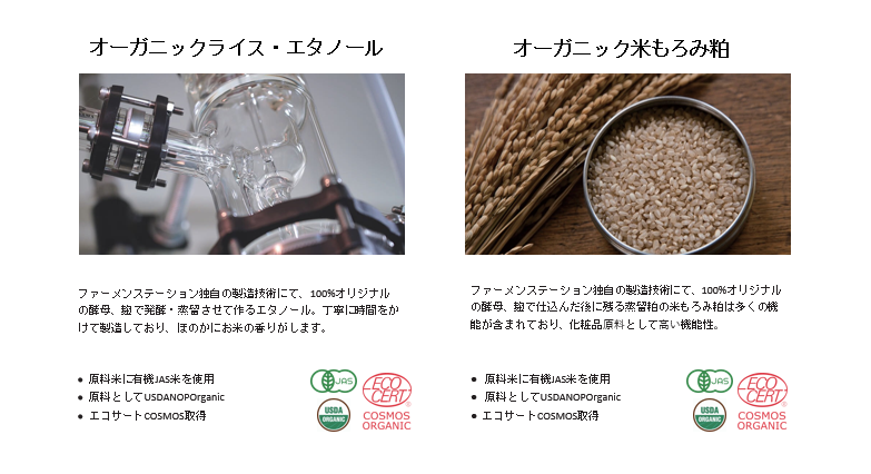 ファーメンステーションでは、有機JAS認証のオーガニック米から、独自の発酵・蒸留技術をもとに、USDAオーガニック認証およびエコサートCOSMOS認証を取得済みのオーガニックライス・エタノールおよびオーガニック米もろみ粕(蒸留粕)をオーガニック原料として製造してまいりました。エタノールは、国産原料をもとに国内製造しており、国内でオーガニック認証を取得しているのはファーメンステーションのエタノールのみとなります。化粧品・日用品・雑貨などにおいてもサステナビリティやトレーサビリティが求められる中で、国産のオーガニック認証のエタノールや発酵原料には大きな期待がされています。