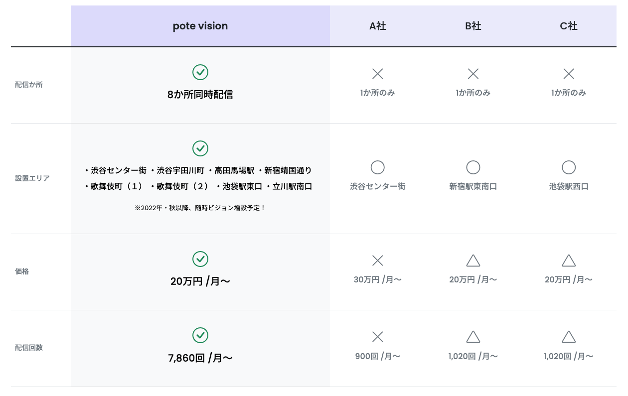「pote vision」は、都内ターミナル駅周辺に限定した街頭LEDビジョンの動画広告配信を、高回数、低価格で提供するDOOH広告サービスです。