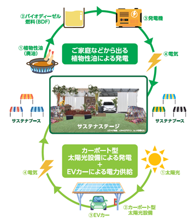 また、同エリア内で使用される電力は、カーポートPVとバイオディーゼル燃料による発電機から創出される100%再生可能エネルギーを供給することで、エネルギーの地産地消を訴求し、本イベントの『サスティナブルチャレンジ』の実現に貢献します。