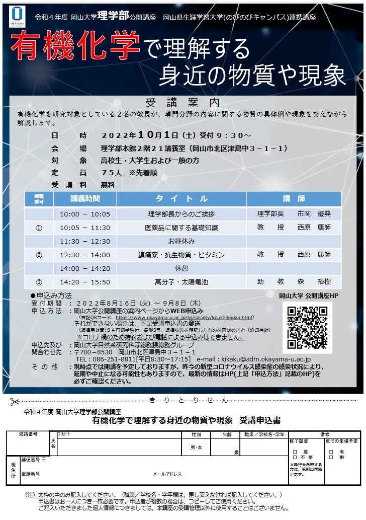 国立大学法人岡山大学(本部:岡山市北区、学長:槇野博史)理学部では、公開講座「有機化学で理解する身近の物質や現象」(岡山県生涯学習大学(のびのびキャンパス)連携講座)を2022年10月1日(土)に本学津島キャンパス(岡山市北区)の理学部本館で開催します。