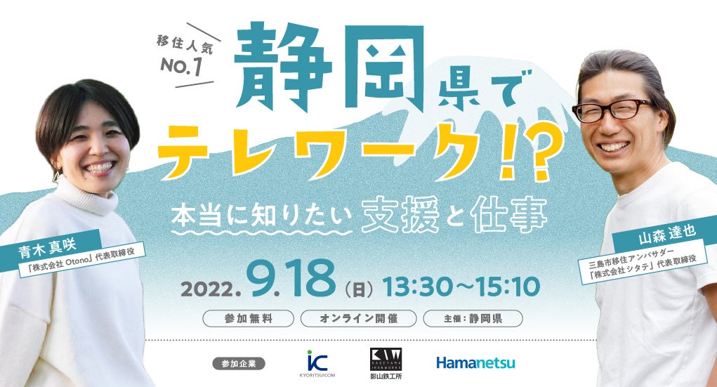 今回のオンラインセミナーでは、2年連続移住人気NO.1の静岡県に移住した青木さん(静岡市在住)・山森さん(三島市在住)がゲストとして登壇。静岡県でのテレワークの魅力、リアルな暮らしについてお話いただきます。