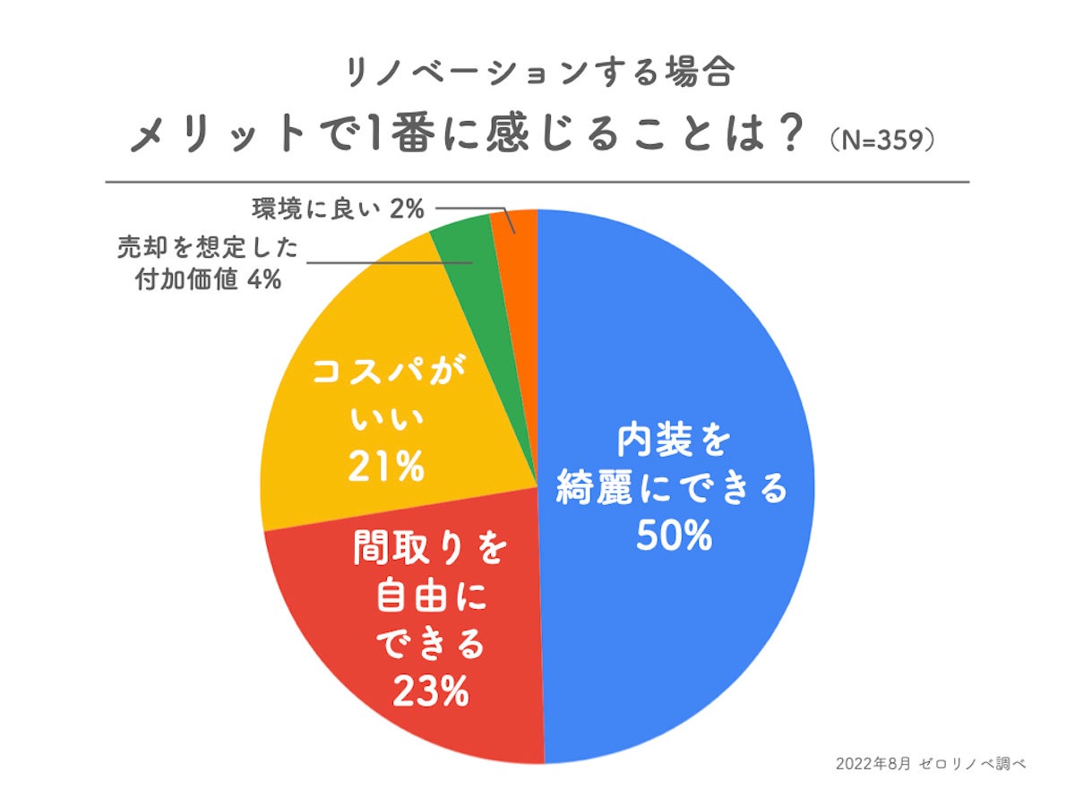 また、「リノベーションのメリットで1番に感じること」の設問において、「内装がきれいになる」が約半数を占めたことから、リノベーションで得られるメリットの認知に伸び代があることが伺えました。
