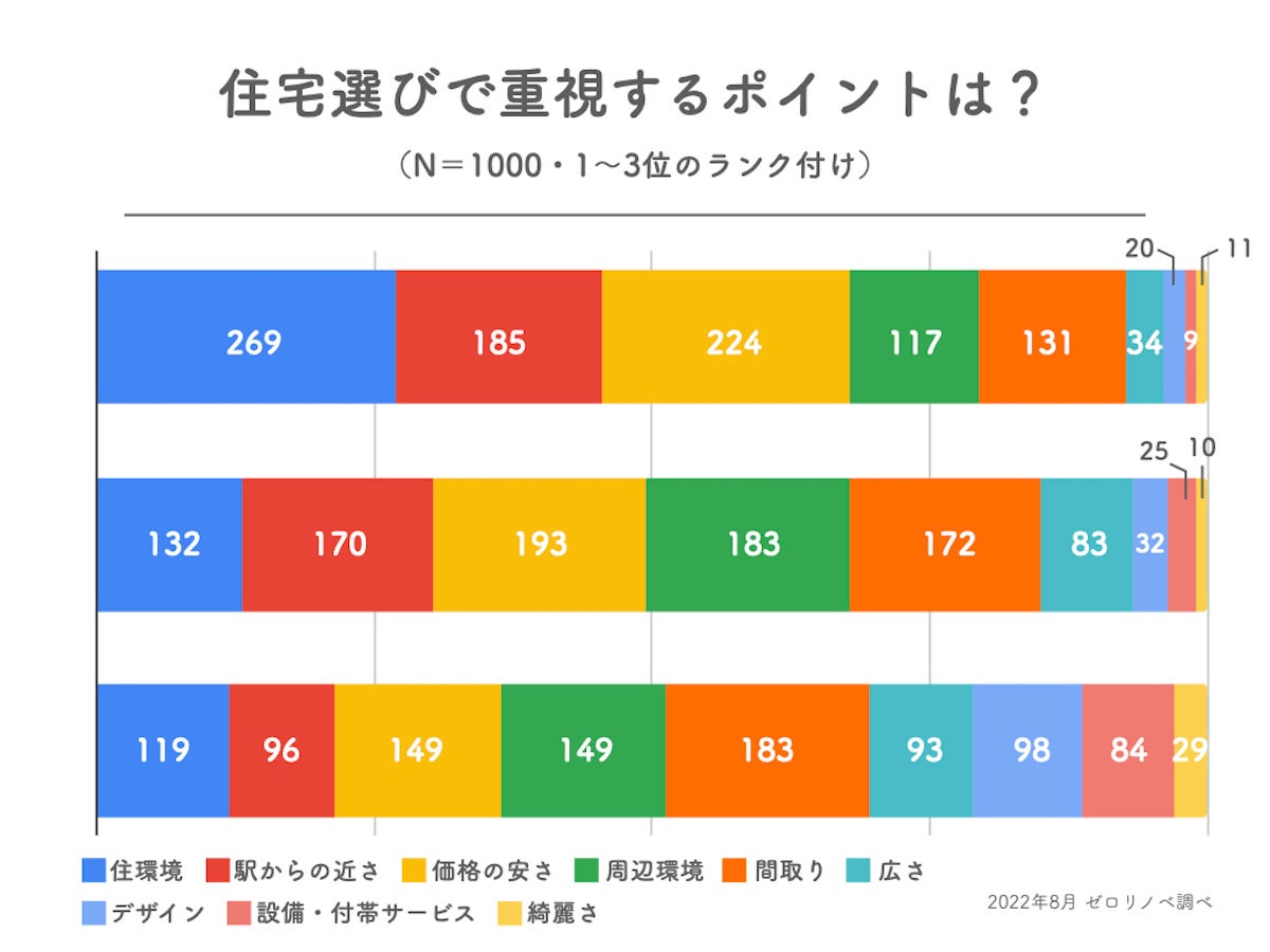 2021年の調査(https://www.zerorenovation.com/blog/pressrelease_202109_renovation_interest/)では3位だった「価格の安さ」が、2022年の調査では1位に、2位だった「駅からの近さ」が4位になったことから、昨今の物件価格や物価の上昇、コロナ禍によるリモートワークの普及が垣間見える結果となりました。