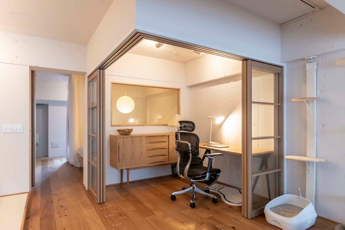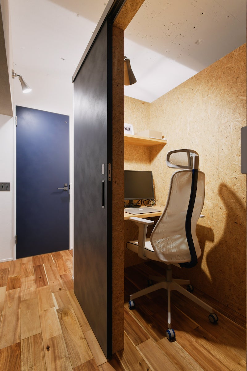 奥さまの出社時は開放的に使い、ビデオ会議時や集中したい時は引き戸を閉めることで、音や存在感の干渉を緩和します。