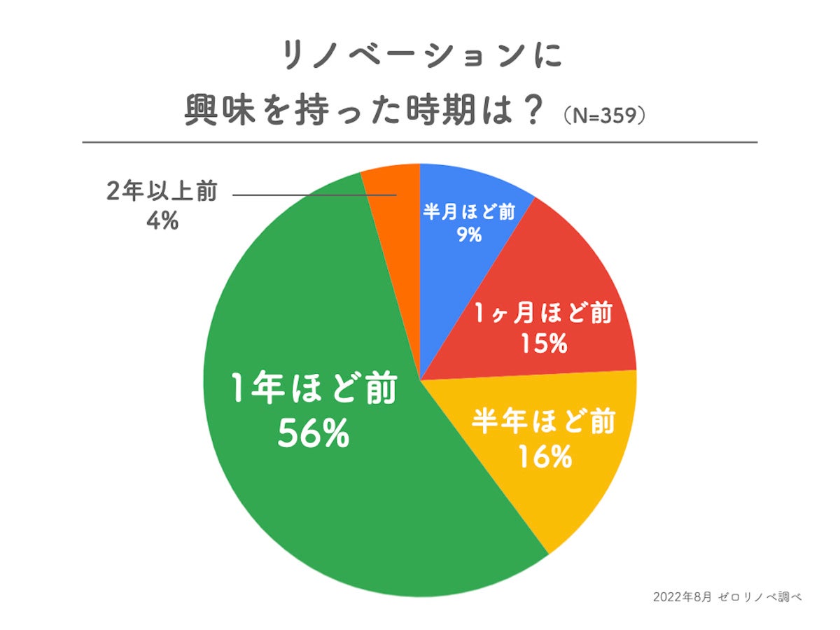 ■「リノベーションに興味を持った時期」は「1年ほど前」が56%。