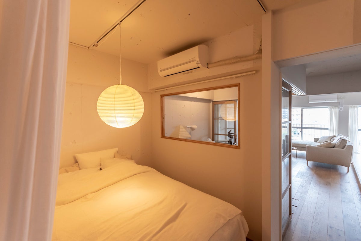 室内窓つきの壁で隔てた先、夫婦の寝室は完全個室にせずカーテンで間仕切りすることでコストカット。
