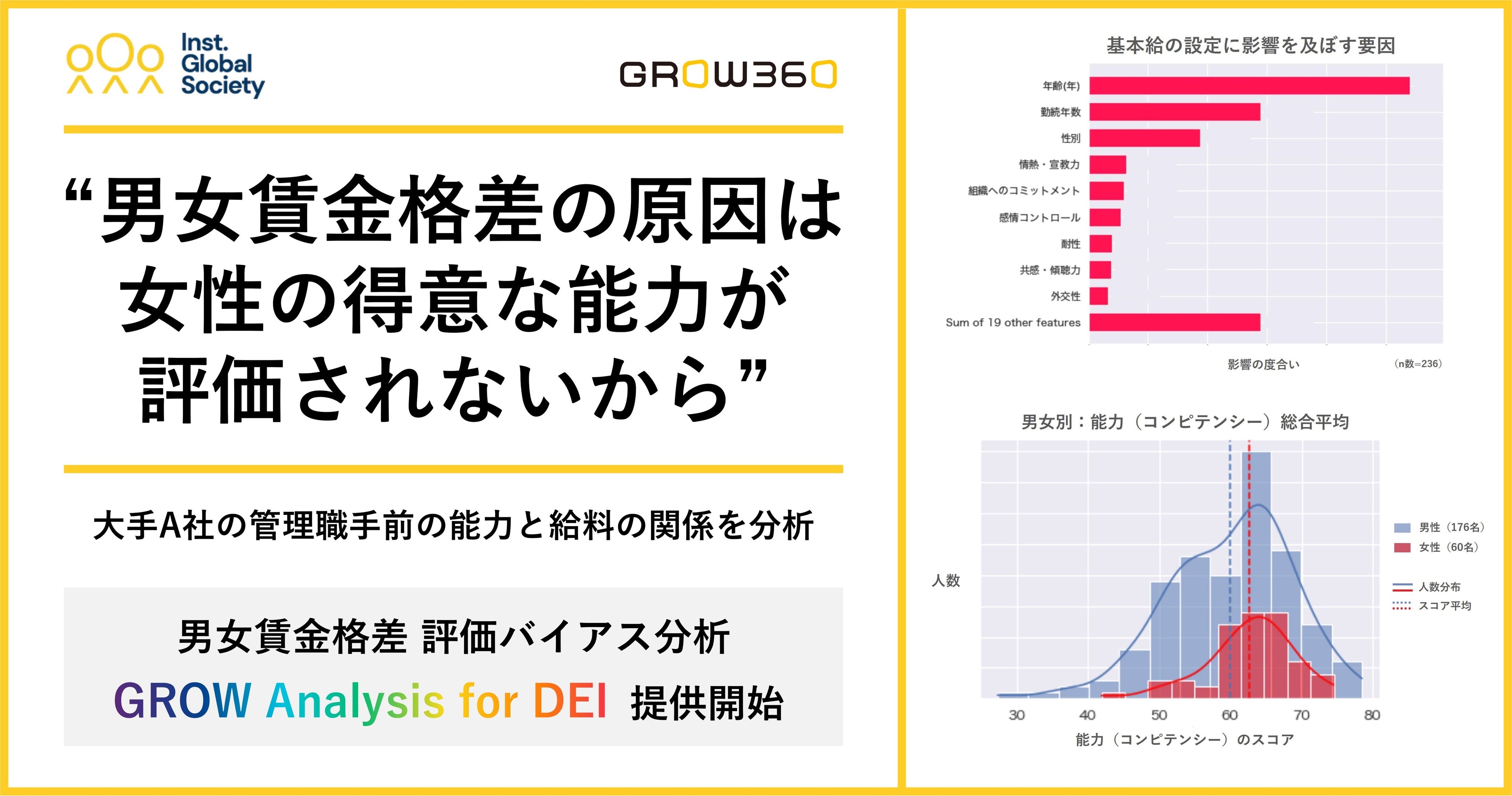 Institution for a Global Society 株式会社(本社 東京都渋谷区、代表取締役社長 福原 正大、以下 IGS)は、「男女賃金格差の要因が、正当な能力評価に基づいたものなのか」を、能力(以下、コンピテンシー※1)などの人材データを用いて分析する、男女賃金格差 評価バイアス分析「GROW Analysis for DEI」を8月より提供開始しました。