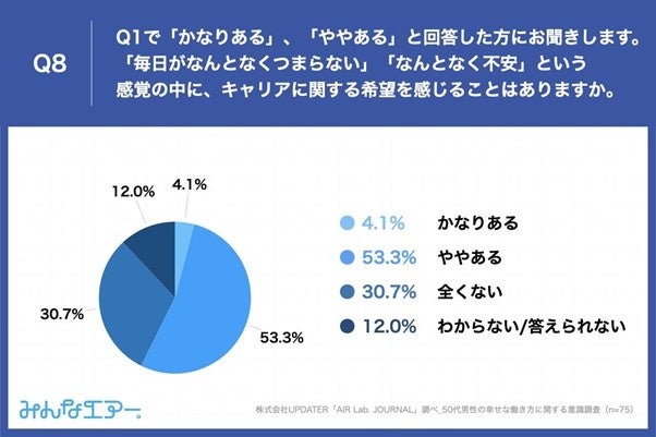Q1で「かなりある」、「ややある」と回答した方に、「Q8.「毎日がなんとなくつまらない」「なんとなく不安」という感覚の中に、キャリアに関する希望を感じることはありますか。」(n=75)と質問したところ、「かなりある」が4.1%、「ややある」が53.3%という回答となりました。