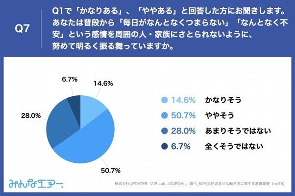 Q1で「かなりある」、「ややある」と回答した方に、「Q7.あなたは普段から「毎日がなんとなくつまらない」「なんとなく不安」という感情を周囲の人・家族にさとられないように、努めて明るく振る舞っていますか。」(n=75)と質問したところ、「かなりそう」が14.6%、「ややそう」が50.7%という回答となりました。