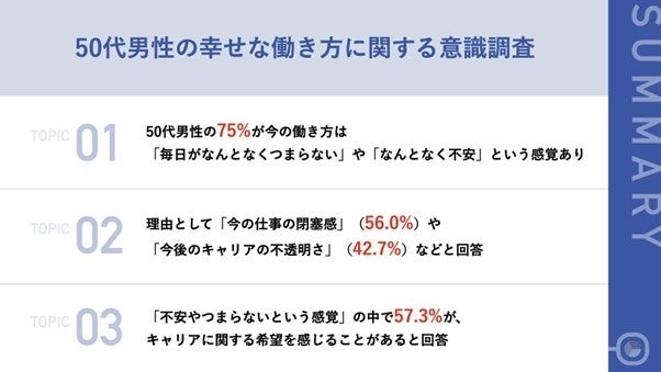 50代男性の75%が今の働き方は「毎日がなんとなくつまらない」や「なんとなく不安」という絶望に近い感情があることが明らかになりました。理由として「今の仕事の閉塞感」(56.0%)や「今後のキャリアの不透明さ」(42.7%)、他にも「毎日同じ事を繰り返して時間を無駄に過ごしているような気がしてならない」という声が挙がりました。さらには65.3%が、そんな不安感を抱えながら、普段は努めて明るく振る舞う実態も判明しました。