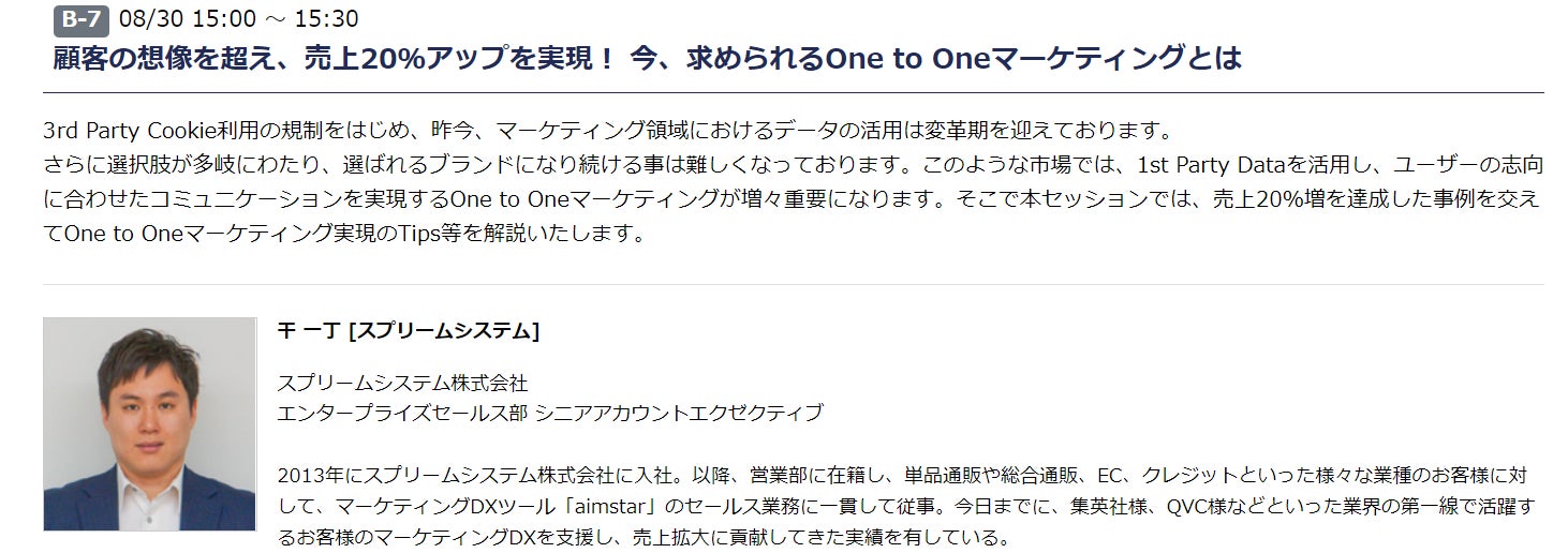 | 概要 | 3rd Party Cookie利用の規制をはじめ、昨今、マーケティング領域におけるデータの活用は変革期を迎えております。 さらに選択肢が多岐にわたり、選ばれるブランドになり続ける事は難しくなっております。このような市場では、1st Party Dataを活用し、ユーザーの志向に合わせたコミュニケーションを実現するOne to Oneマーケティングが増々重要になります。 そこで本セッションでは、売上20%増を達成した事例を交えてOne to Oneマーケティング実現のTips等を解説いたします |