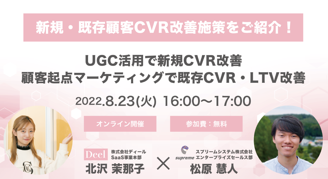 スプリームシステム株式会社(本社:東京都豊島区、代表取締役:佐久間 卓哉)は、2022年8月23日(火)16時から株式会社ディールと共同で「【新規・既存顧客CVR改善施策をご紹介!〜UGC活用で新規CVR改善・顧客起点マーケティングで既存CVR・LTV改善〜」をテーマに、無料オンラインセミナーを開催いたします。新規CV獲得を悩んでいる方やLTV向上や既存顧客育成にご興味がある方は、是非ご参加ください。