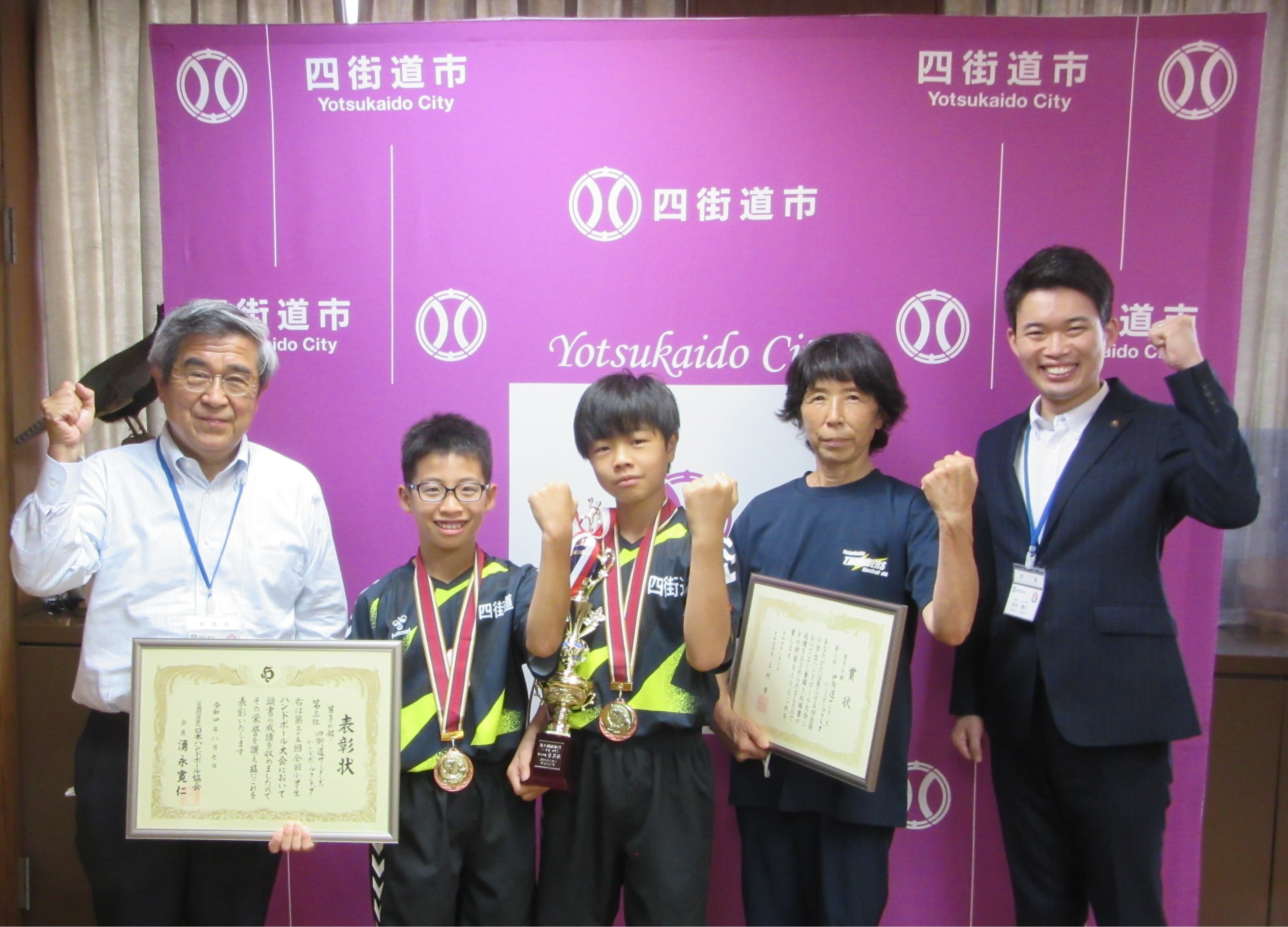 令和4年8月4日(木)から8月7日(日)に、京都府で開催された「第35回全国小学生ハンドボール大会」に出場し、男子44チームによるトーナメント戦の末、3位という成績をおさめられた「四街道サンダーズハンドボールクラブスポーツ少年団」の代表者3名が、鈴木陽介市長を表敬訪問されました。