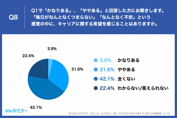Q1で「かなりある」「ややある」と回答した方に、「「毎日がなんとなくつまらない」「なんとなく不安」という感覚の中に、キャリアに関する希望を感じることはありますか。」(n=76)と質問したところ、「かなりある」が3.9%、「ややある」が31.6%という回答となりました。