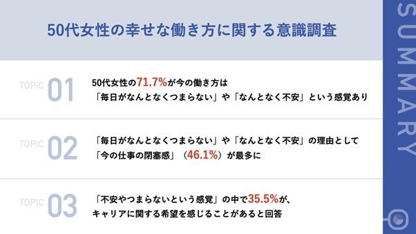 - 50代女性の71.7%が今の働き方は「毎日がなんとなくつまらない」、「なんとなく不安」という感覚あり