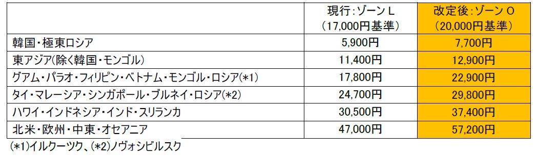 運賃額 : 日本発旅程 (金額はお一人さま一区間片道あたり)