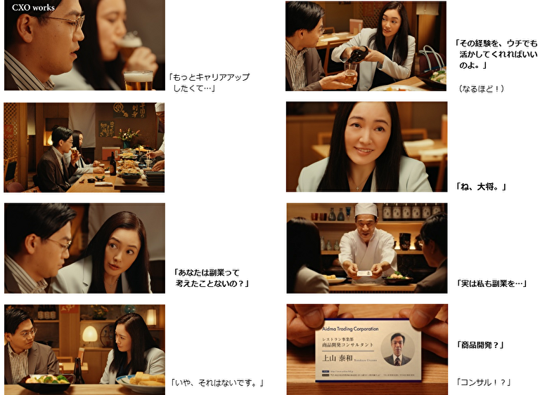居酒屋のカウンターで仲間由紀恵さん演じるマーケティング部部長が、部下のキャリアアップのために副業を勧めます。仲間部長と部下役のたけるさんの会話を聞きながら、気さくに接客している大将。実は、「CXO works」で副業をやっていたという内容です。大将の意外な副業にも注目してご覧ください。