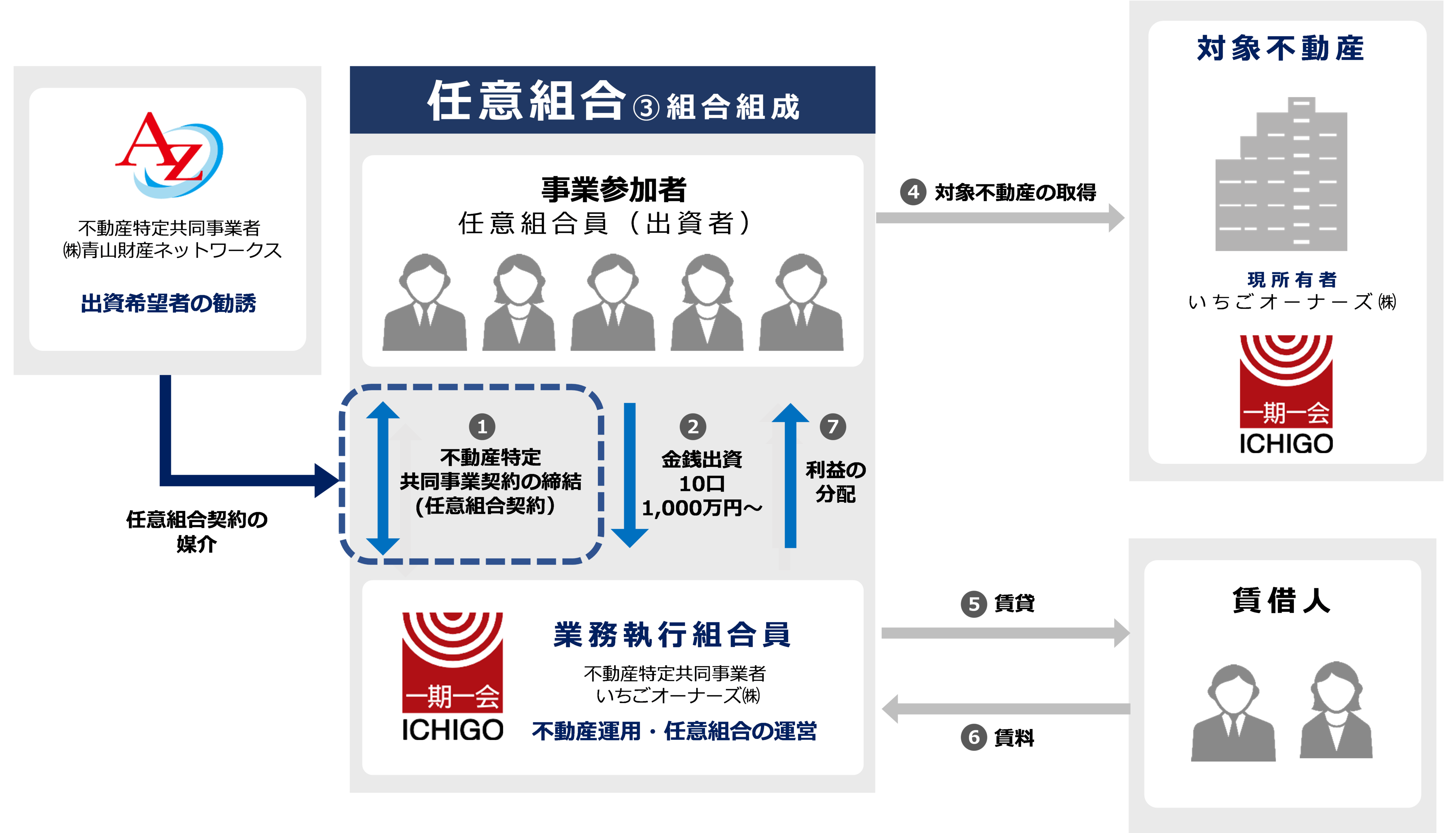 本契約は、いちごオーナーズが不動産特定共同事業スキームを活用して提供する不動産小口化商品について、不動産特定共同事業者である青山財産ネットワークスが、出資希望者の勧誘、任意組合契約の媒介を行うものです。