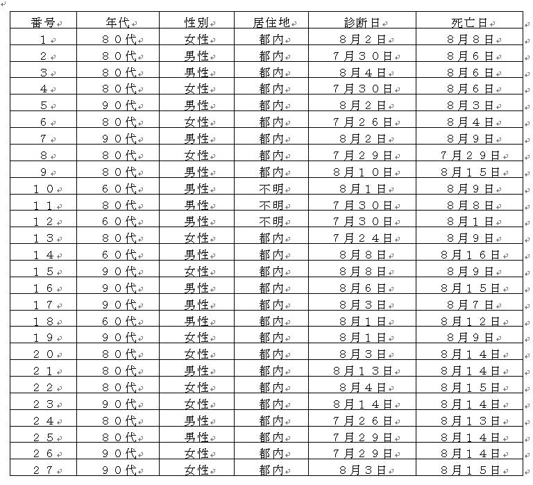 新型コロナウイルスに関連した患者の死亡について business Twitter Facebook はてブ Pocket LINE コピー 2022.08.18 この記事は約1分で読めます。 都内で新型コロナウイルスに感染した方が死亡されましたのでお知らせします。 お亡くなりになった方のご冥福をお祈り申し上げます。 ※ 患者・御家族の人権尊重・個人情報保護に御理解と御配慮をお願いします。