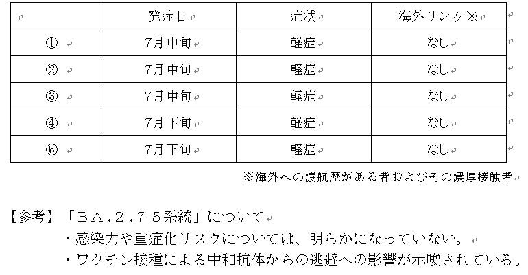 この度、ゲノム解析の結果、新たに、オミクロン株の亜系統である「BA.2.75系統」を5例確認したため、下記のとおり、お知らせいたします。