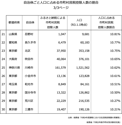 この上位30自治体の中では、川崎市のふるさと納税利用者数が最も多くなっています。人口1万人以下の山梨県忍野村が21位の10.81%となっています。