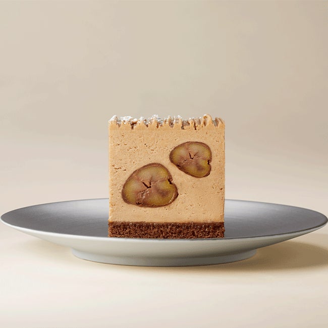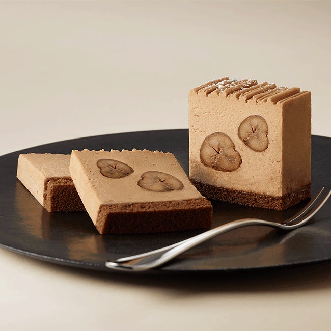 食感の違いを楽しめる2つの層からなる『和栗のカレ・オ・ショコラ』は、フランスの古典菓子であるパン・ド・ジェンヌを薄く敷いた土台に、栗の餡とガナッシュ、カスタードをあわせたクリームを優美に形成。中央には、渋皮と一緒に黒砂糖で艶やかに煮込んだ大粒の栗を丸ごと一つ忍ばせました。ゆっくりとナイフを入れると、中から贅沢な栗の断面が顔を覗かせます。