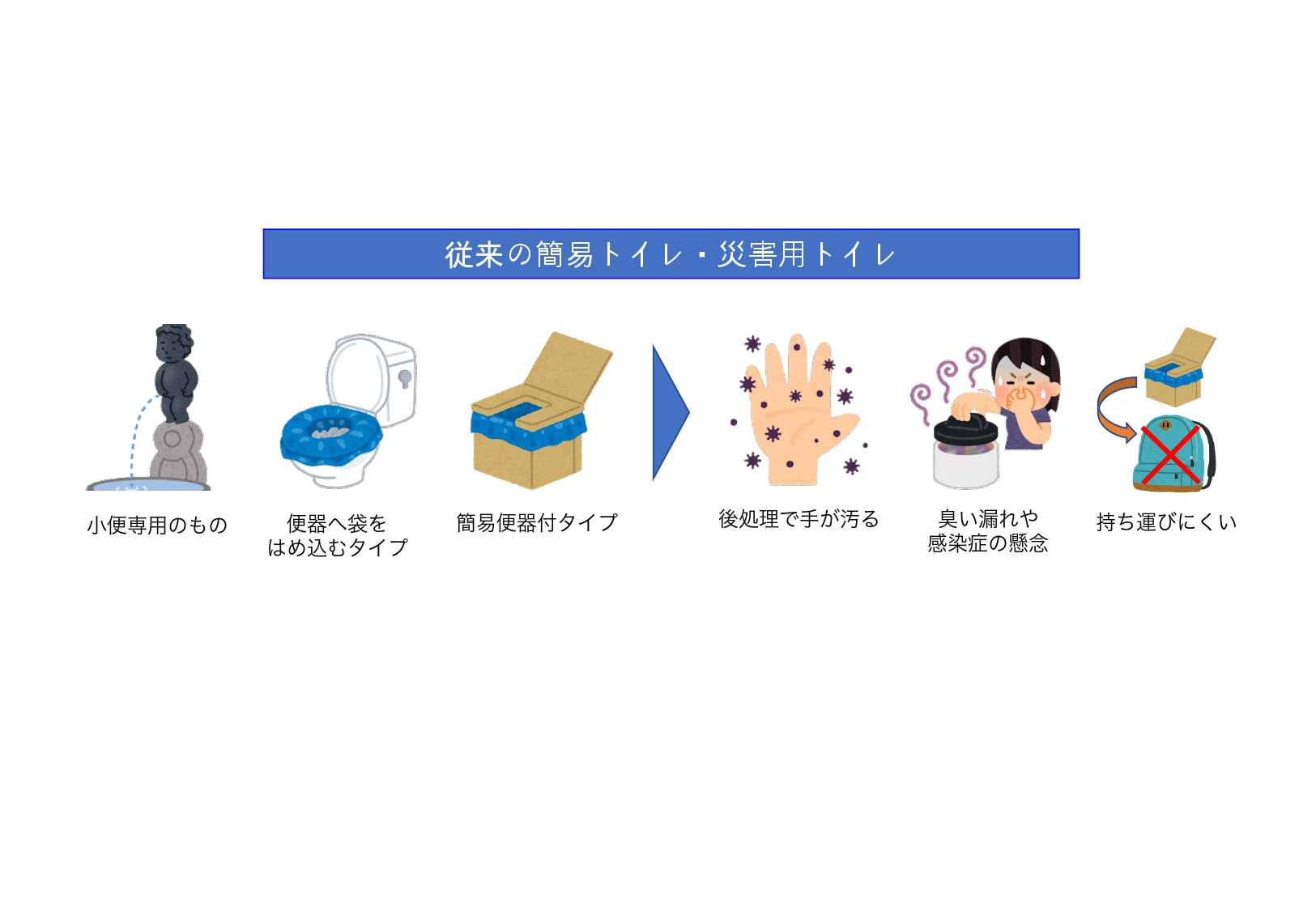現在、市販されている簡易トイレ、災害用トイレは、小便専用などの用途が限られるもの、簡易便器とセットとなっており持ち運びにくいもの、便器設備にはめ込む袋タイプで後処理時に手が汚れる、臭い漏れの心配があるもの などが多くあり、非常持ち出し袋にセットされている製品や、備蓄されている製品の多くも同じタイプの製品が考えられます。